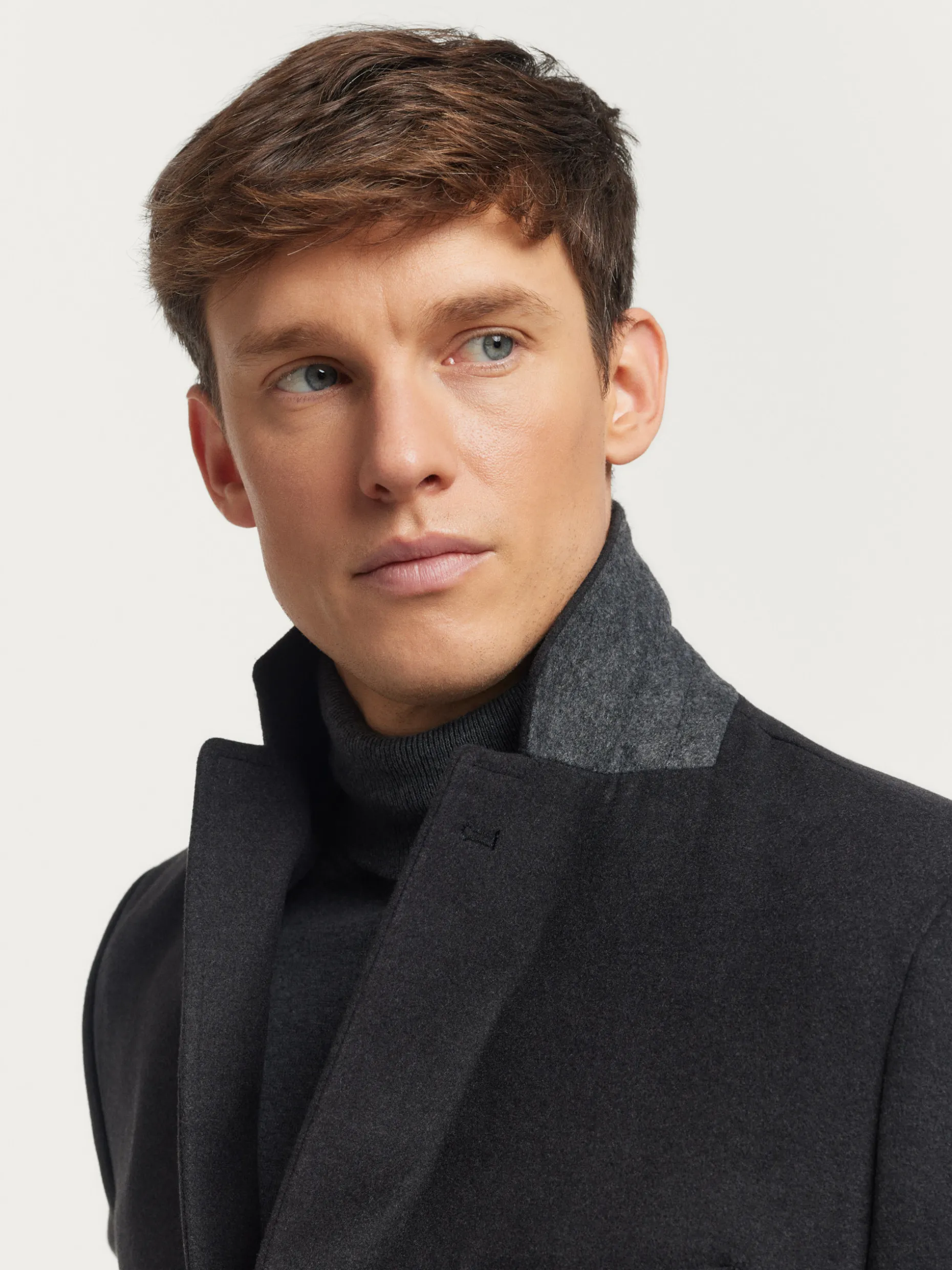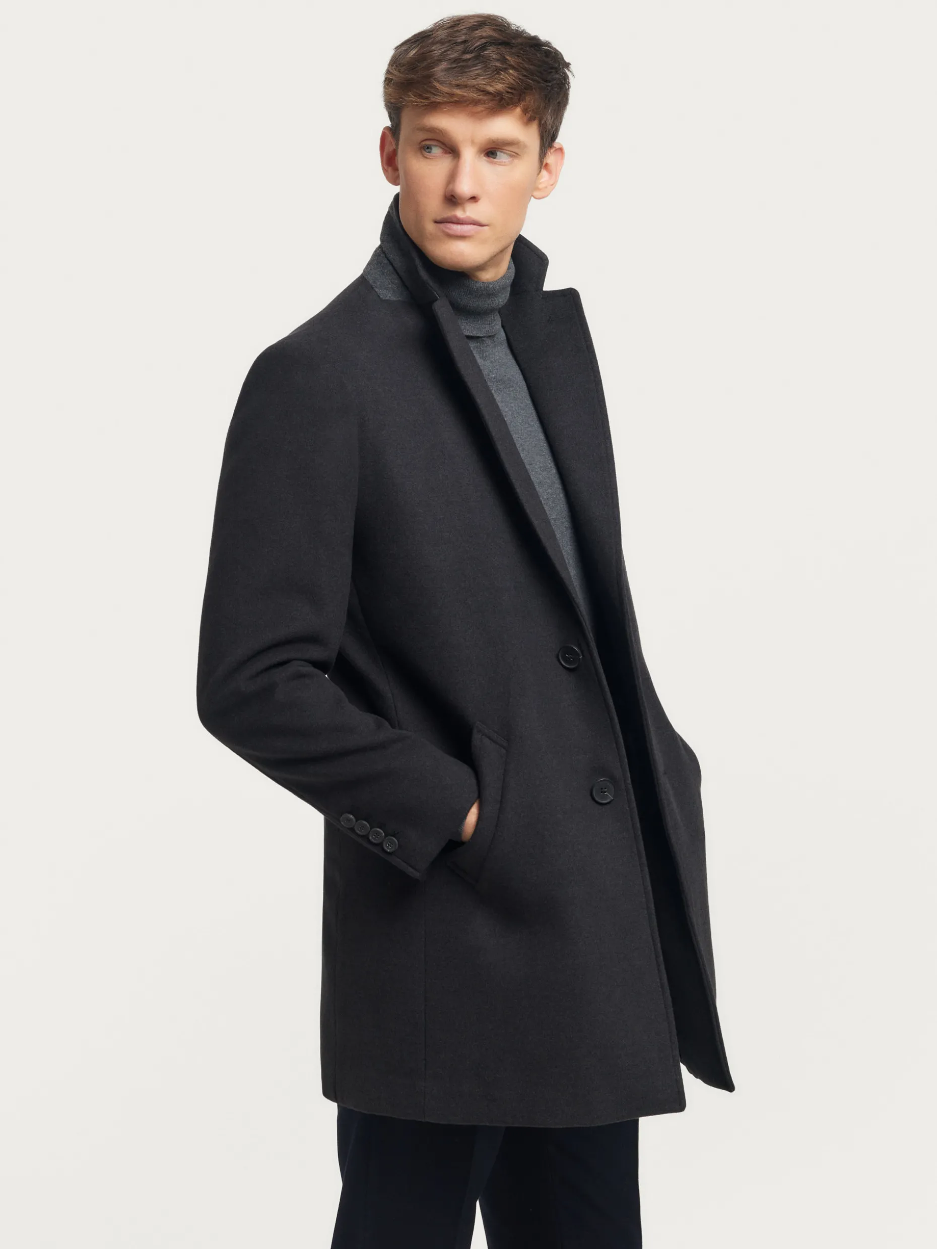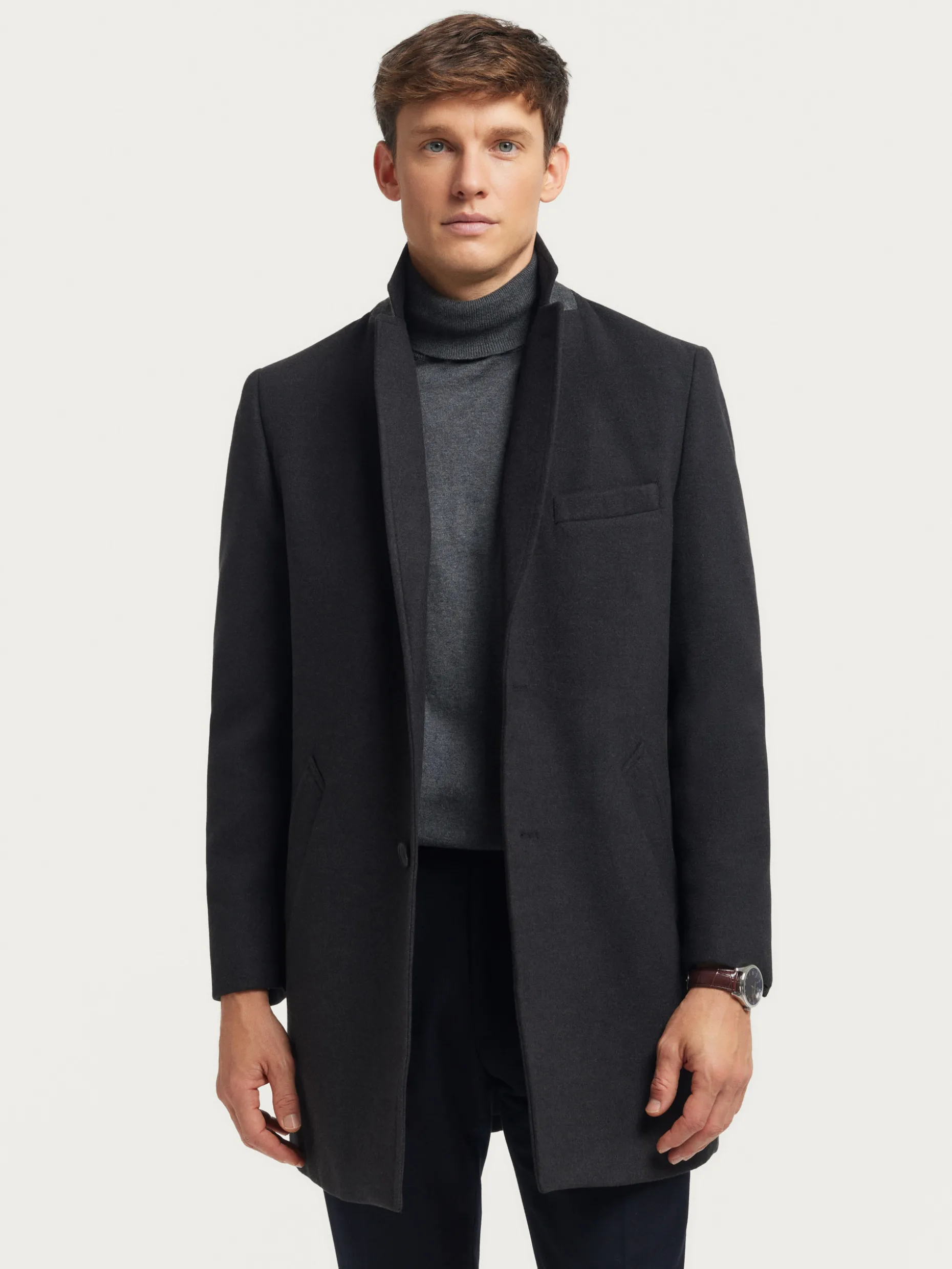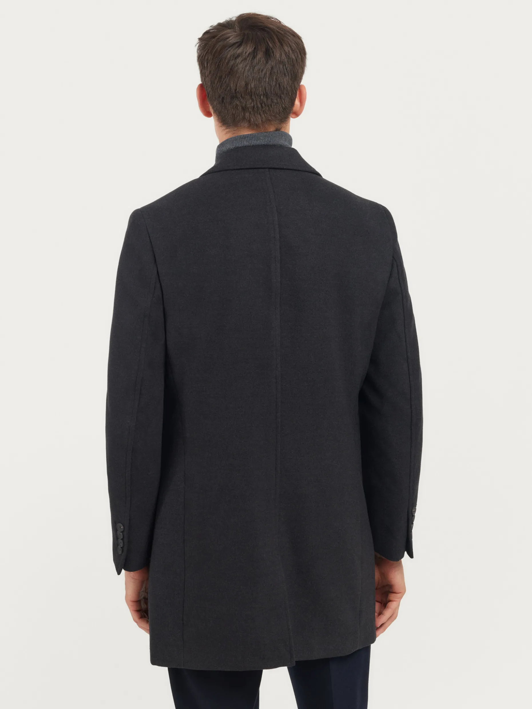 Abrigo de paño liso con cuello y solapa. Cierre central mediante botones, manga larga con botones en su terminación y dos bolsillos a la altura de la cintura. Abertura central en el bajo de la espalda. Corte regular fit.