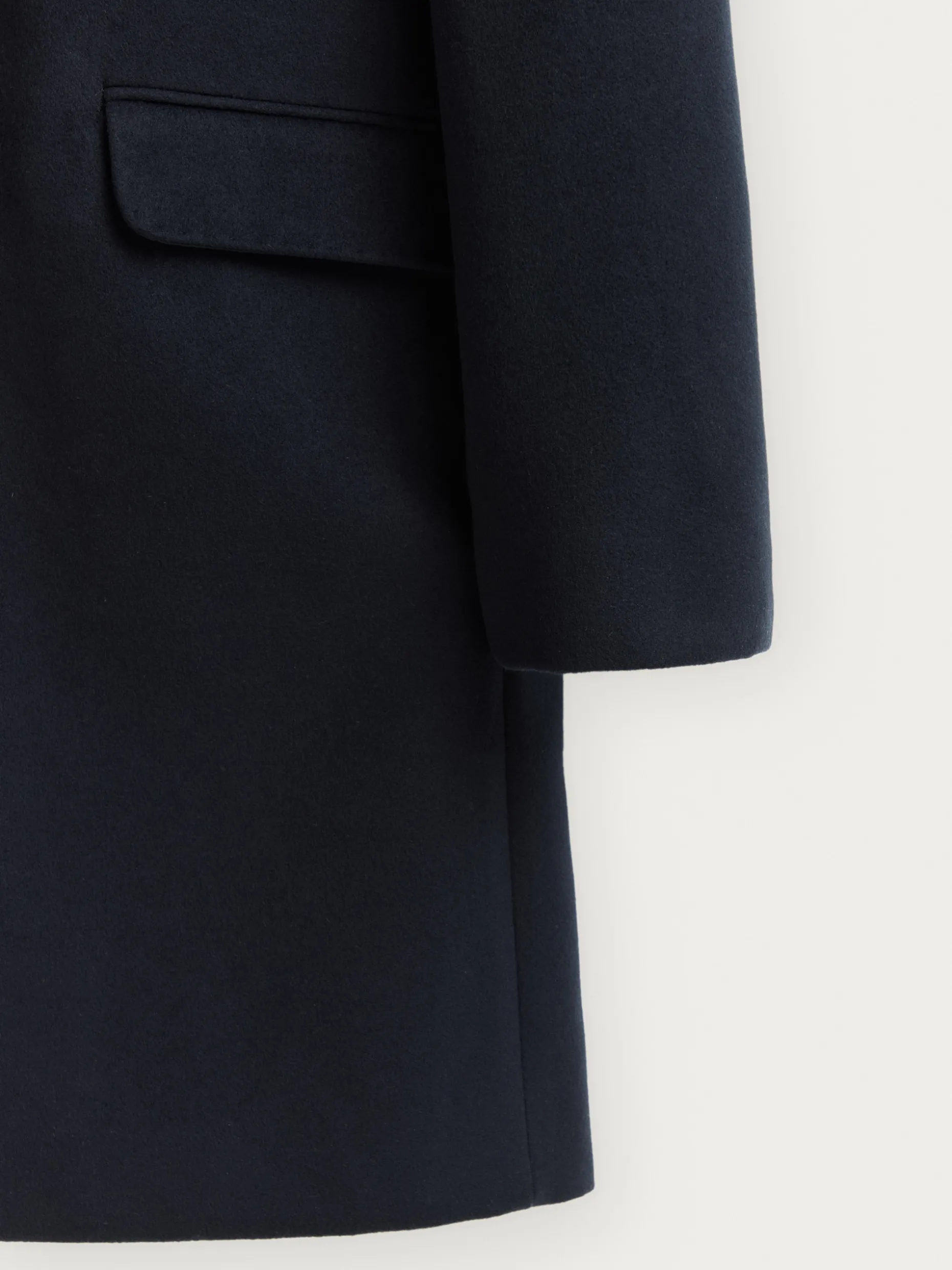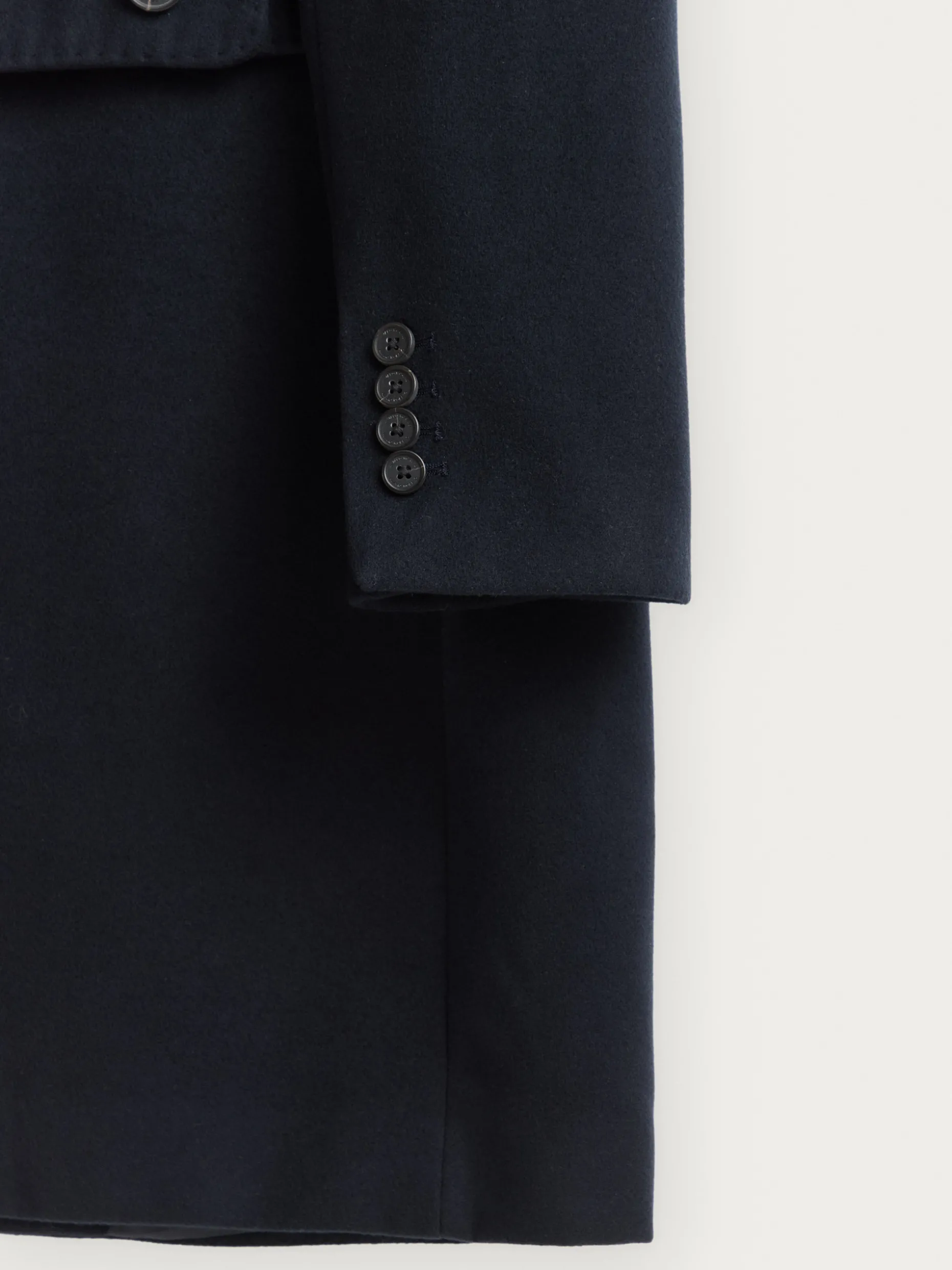 Abrigo con cuello y solapa, cierre central simple mediante dos botones y ajuste martingala en la cintura-espalda. Bolsillo en el pecho y tres bolsillos de solapa en la cintura. Manga con terminación de botones decorativos. Abertura en el bajo. Forrado en su interior con dos bolsillos.