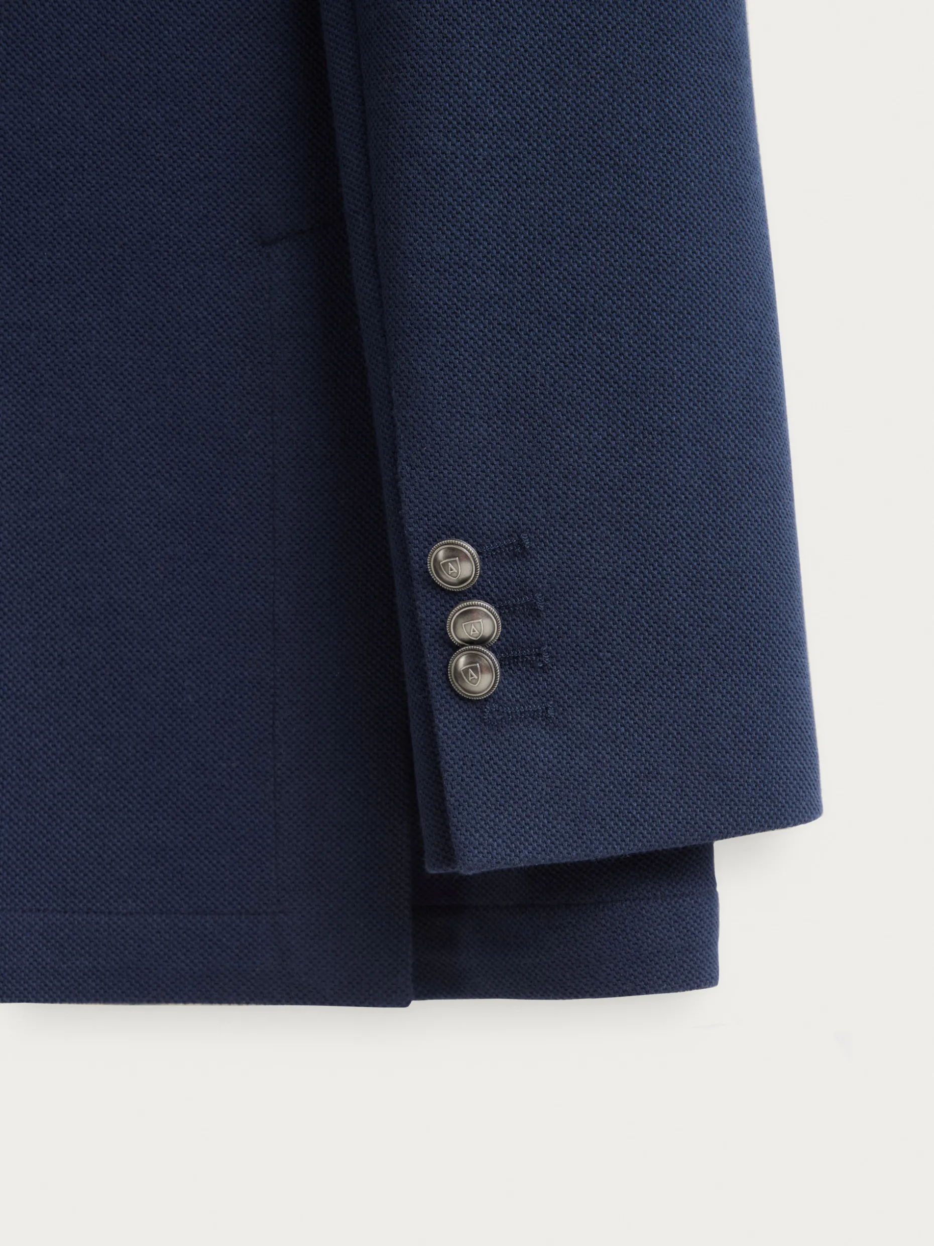 Americana confeccionada en tejido de estructura de corte slim fit. Cuenta con cuello y solapa, cierre central simple mediante dos botones y puños con botones decorativos. Pinzas en el frontal, tres bolsillos de solapa en la cintura y un bolsillo a la altura del pecho. Botones personalizados metálicos. Dos bolsillos en su interior.
