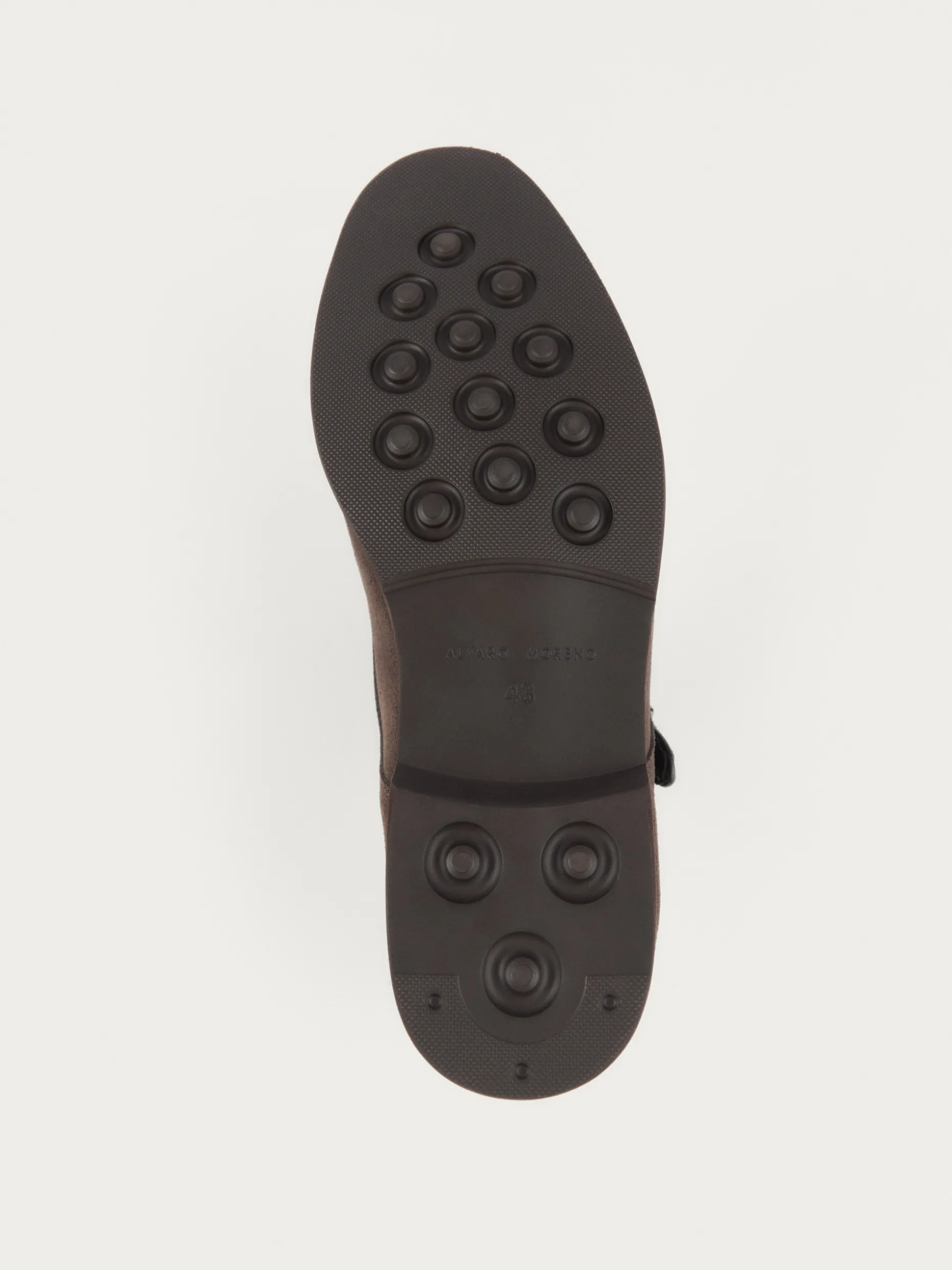 Blucher confeccionado en serraje con cierre mediante doble hebilla, ligera elevación en la suela y pespuntes al tono. Suela de goma. Talón reforzado mediante tira.