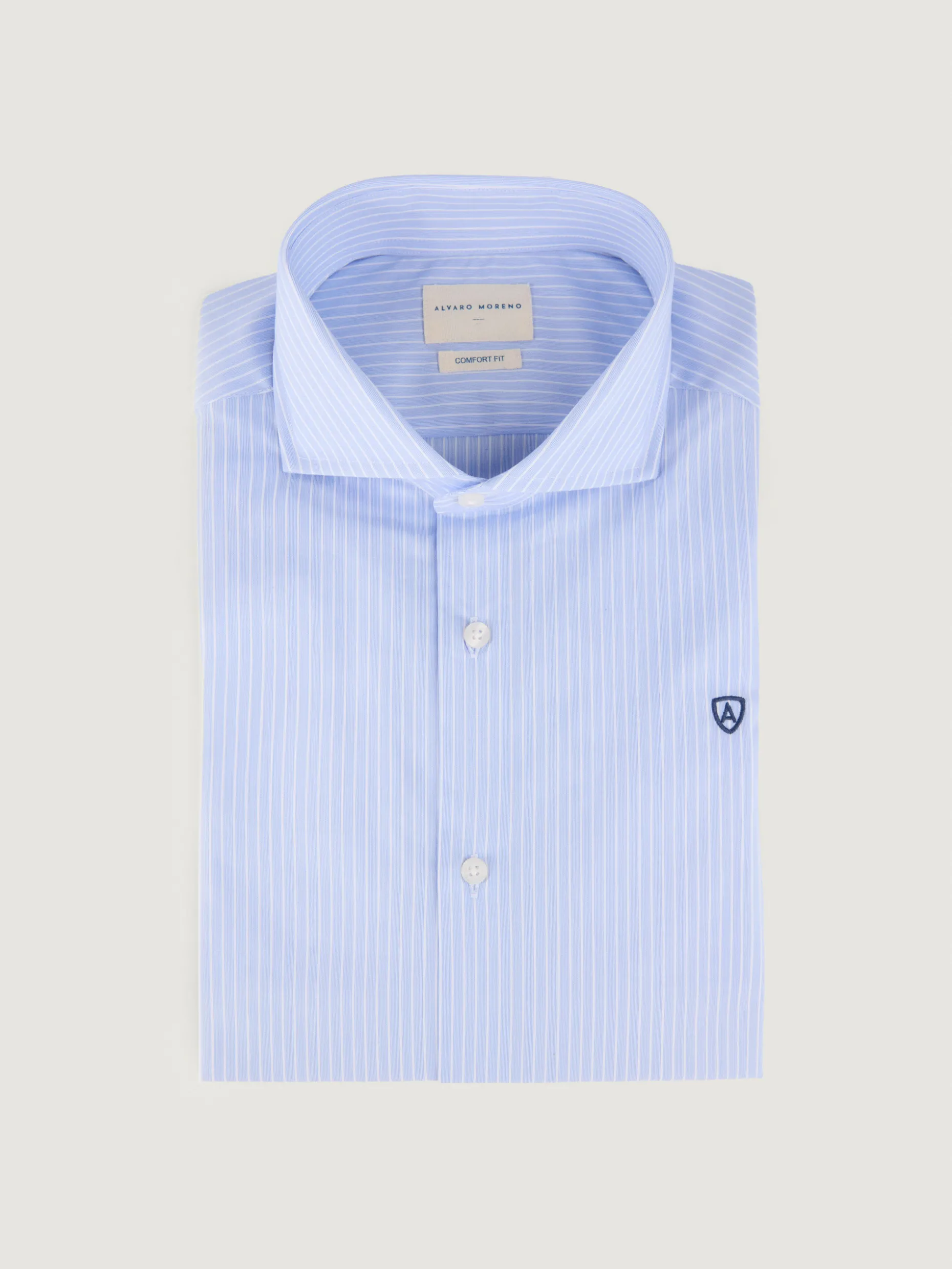 Camisa de vestir a rayas confeccionada en algodón. Cuenta con cuello italiano, manga larga con puños simples y logo de la marca grabado en el frontal. Corte slim fit.