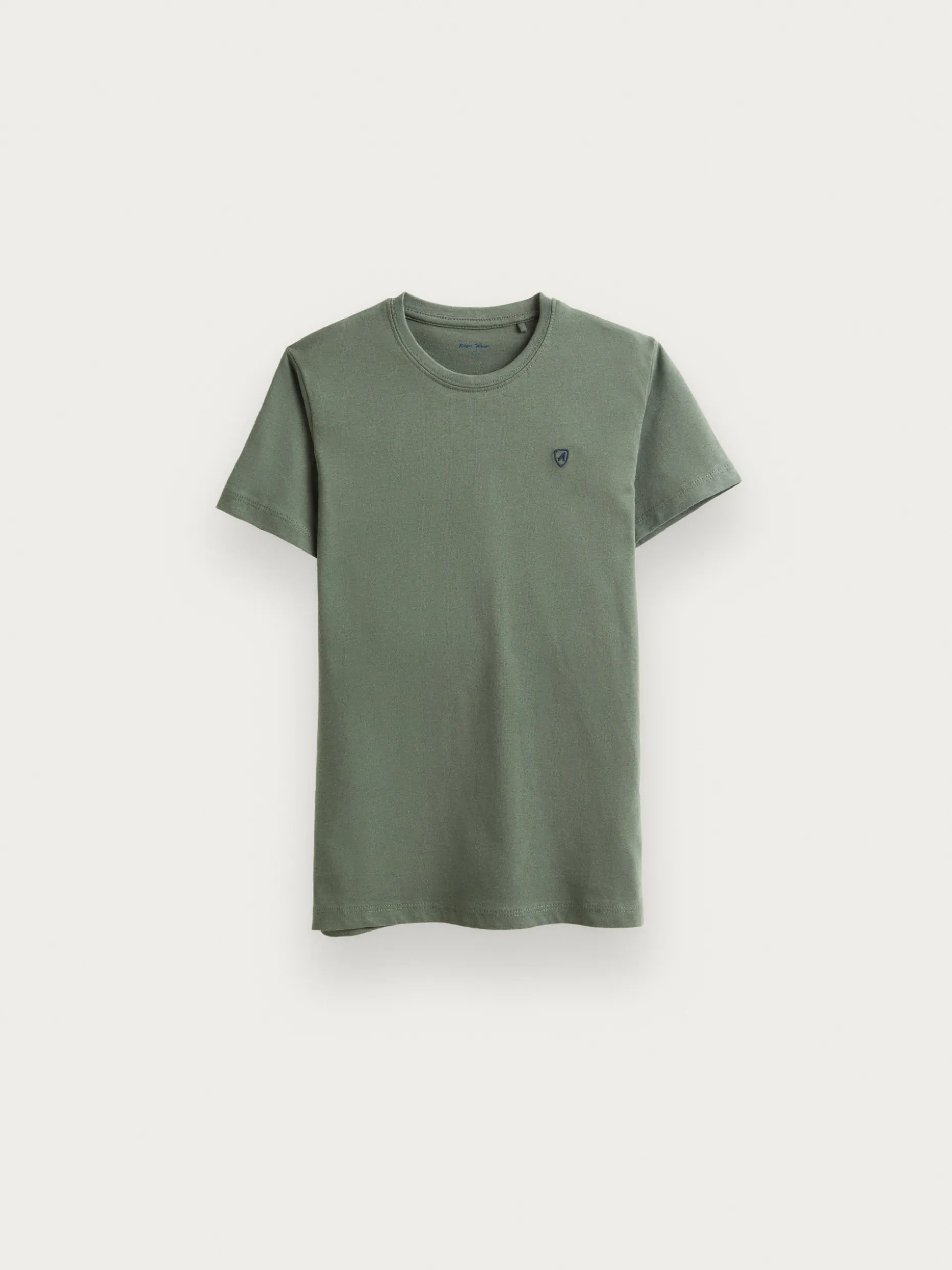 Camiseta lisa confeccionada en algodón con cuello redondo, manga corta y logo de la marca grabado en el frontal. Etiqueta canvas en el lateral. Corte regular fit.