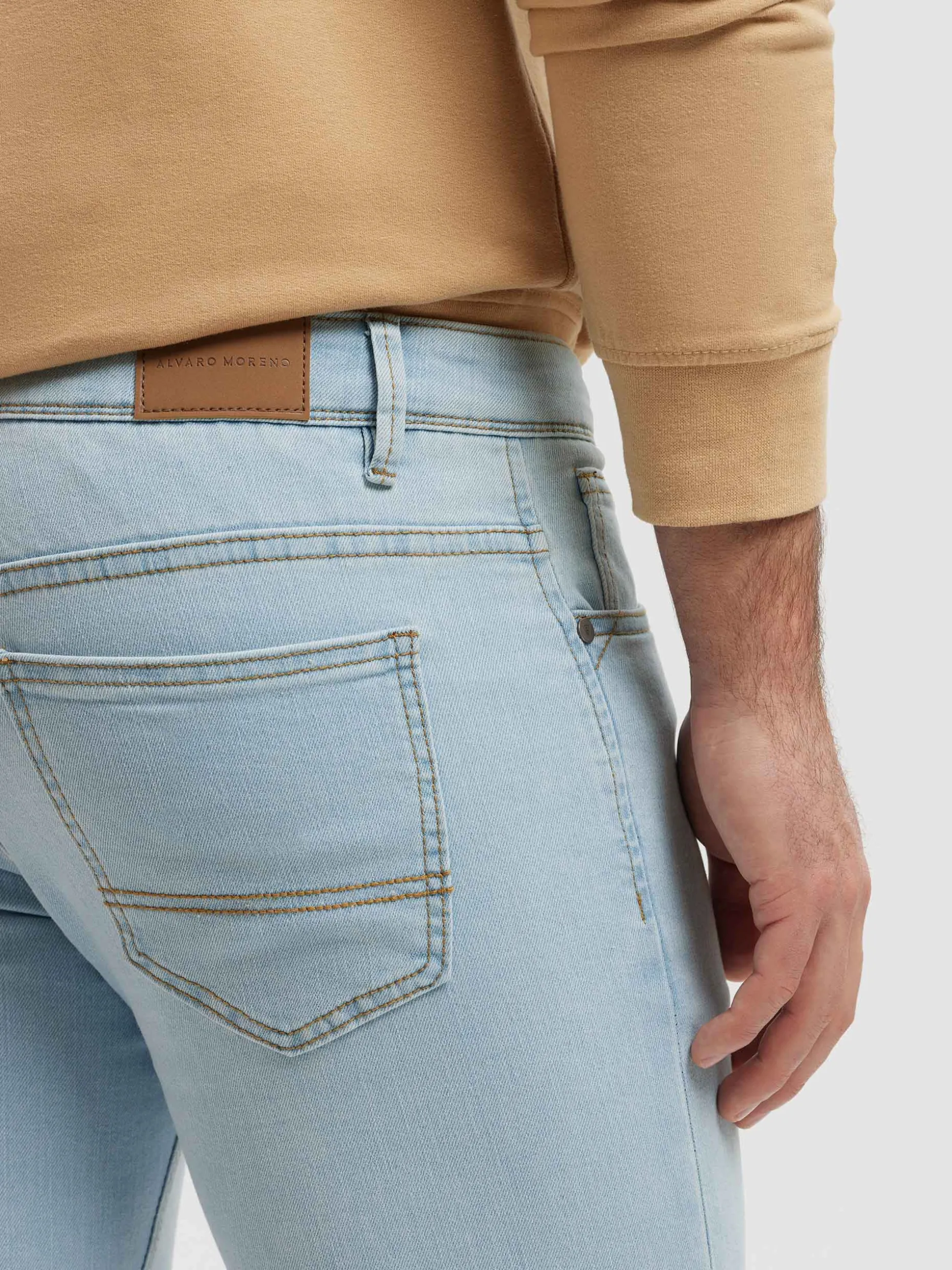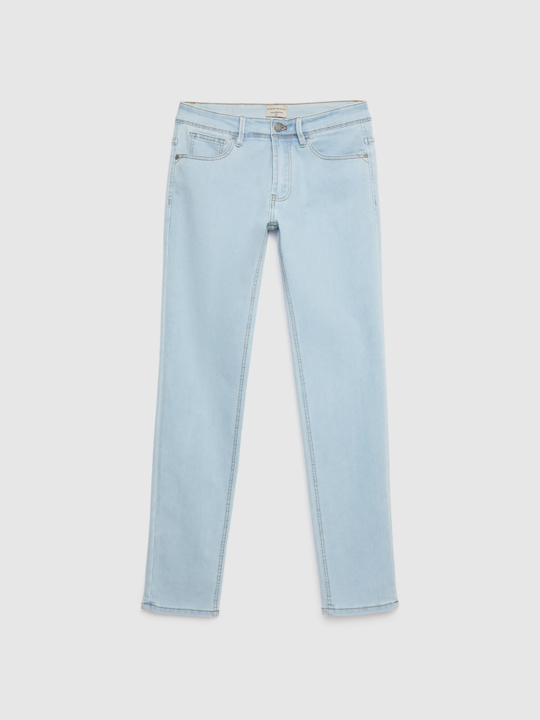 Pantalón denim de corte regular fit con cinco bolsillos y cierre central mediante botón y cremallera, pespuntes en color camel, fornituras personalizadas y etiqueta en efecto piel en la cinturilla.