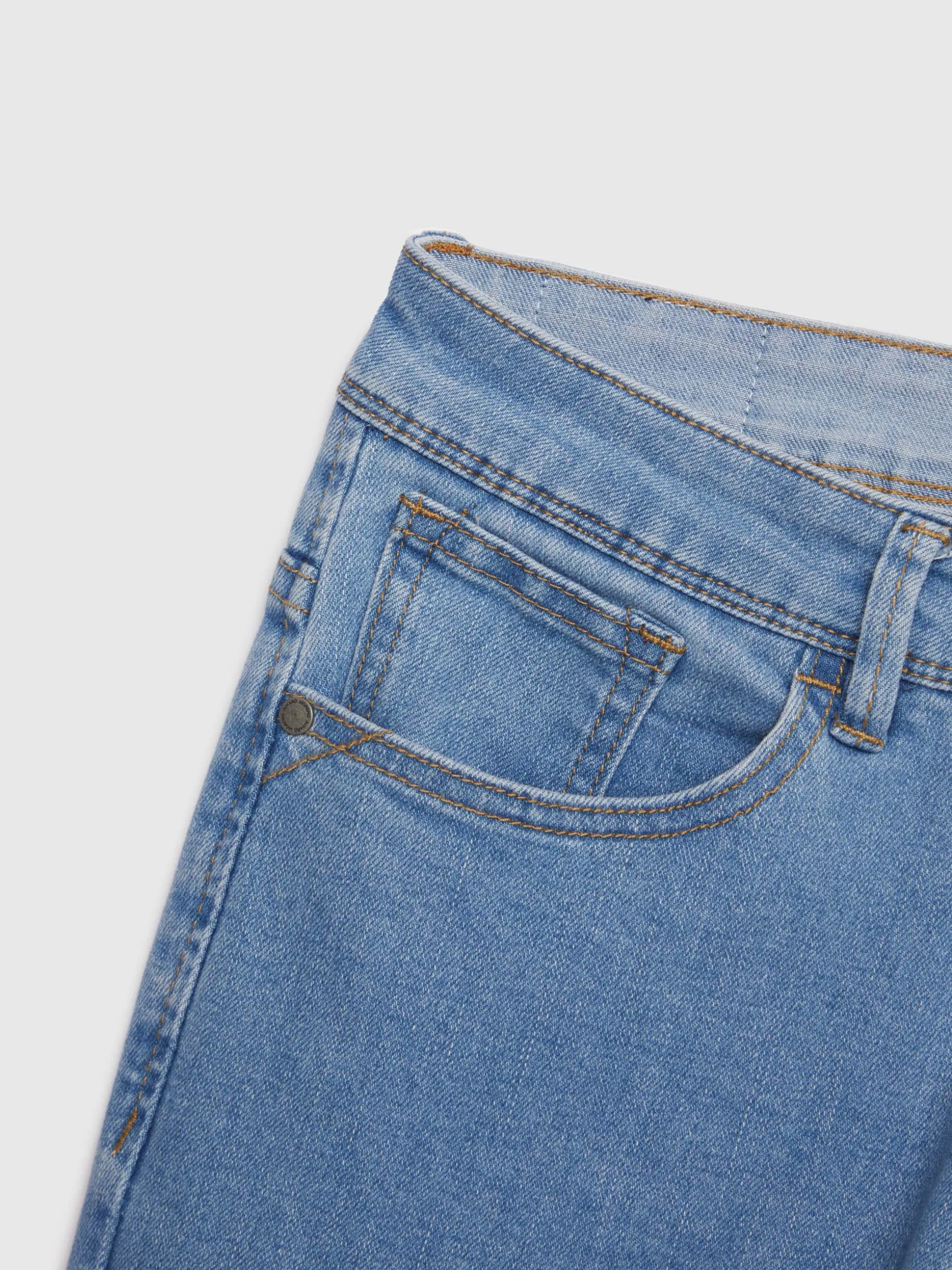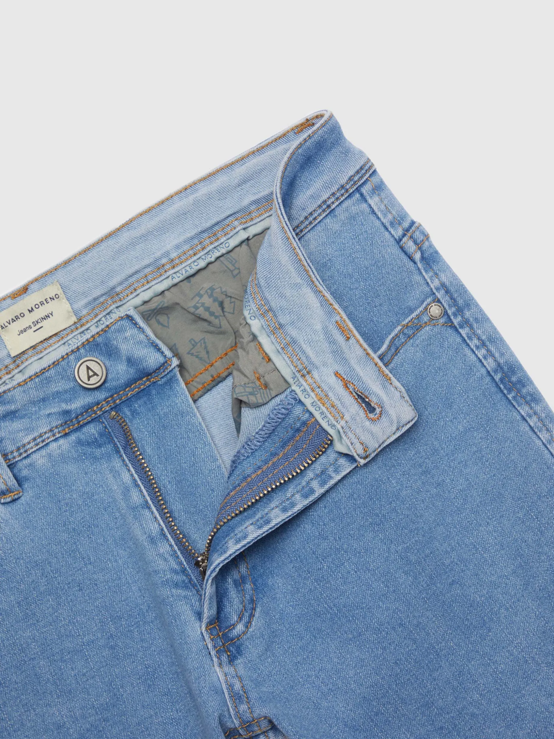 Pantalón denim de corte skinny fit con cinco bolsillos y cierre central mediante botón y cremallera, pespuntes en color camel, fornituras personalizadas y etiqueta en efecto piel en la cinturilla.