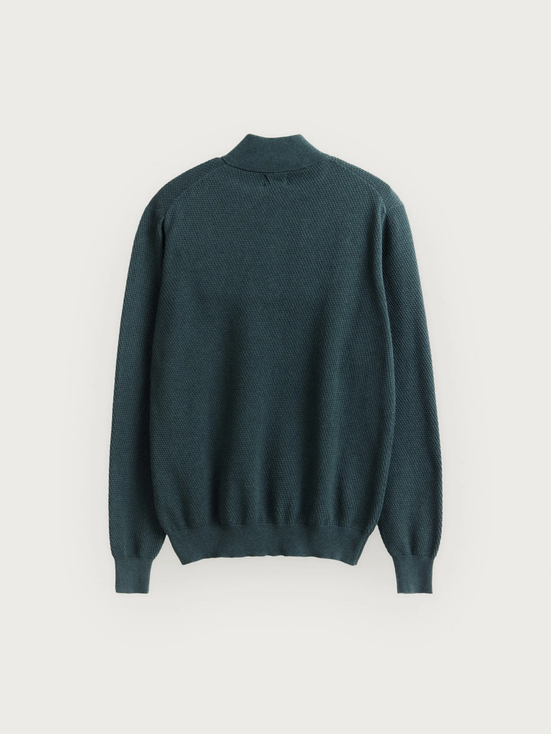 Jersey confeccionado en algodón con estructura en su tejido. Cuenta con cuello alto con medio cierre de cremallera y cuello, puños y bajo en acabado elástico. Corte regular fit.
