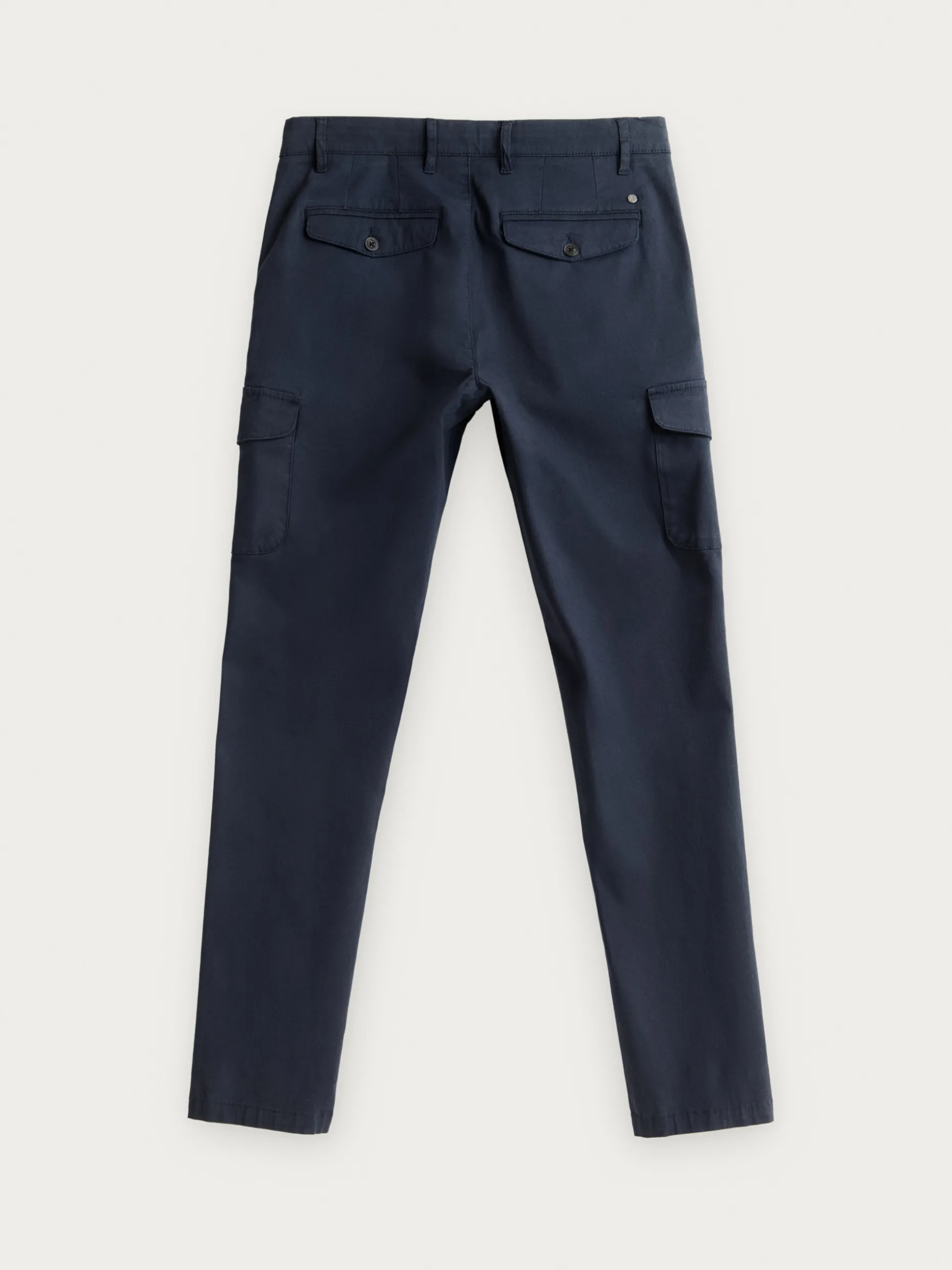 Pantalón cargo con cierre central mediante botón y cremallera. Dos bolsillos laterales y dos más bajos con cierre mediante tapeta y botón. Dos bolsillos traseros y logo grabado sobre uno de ellos. Corte regular fit.