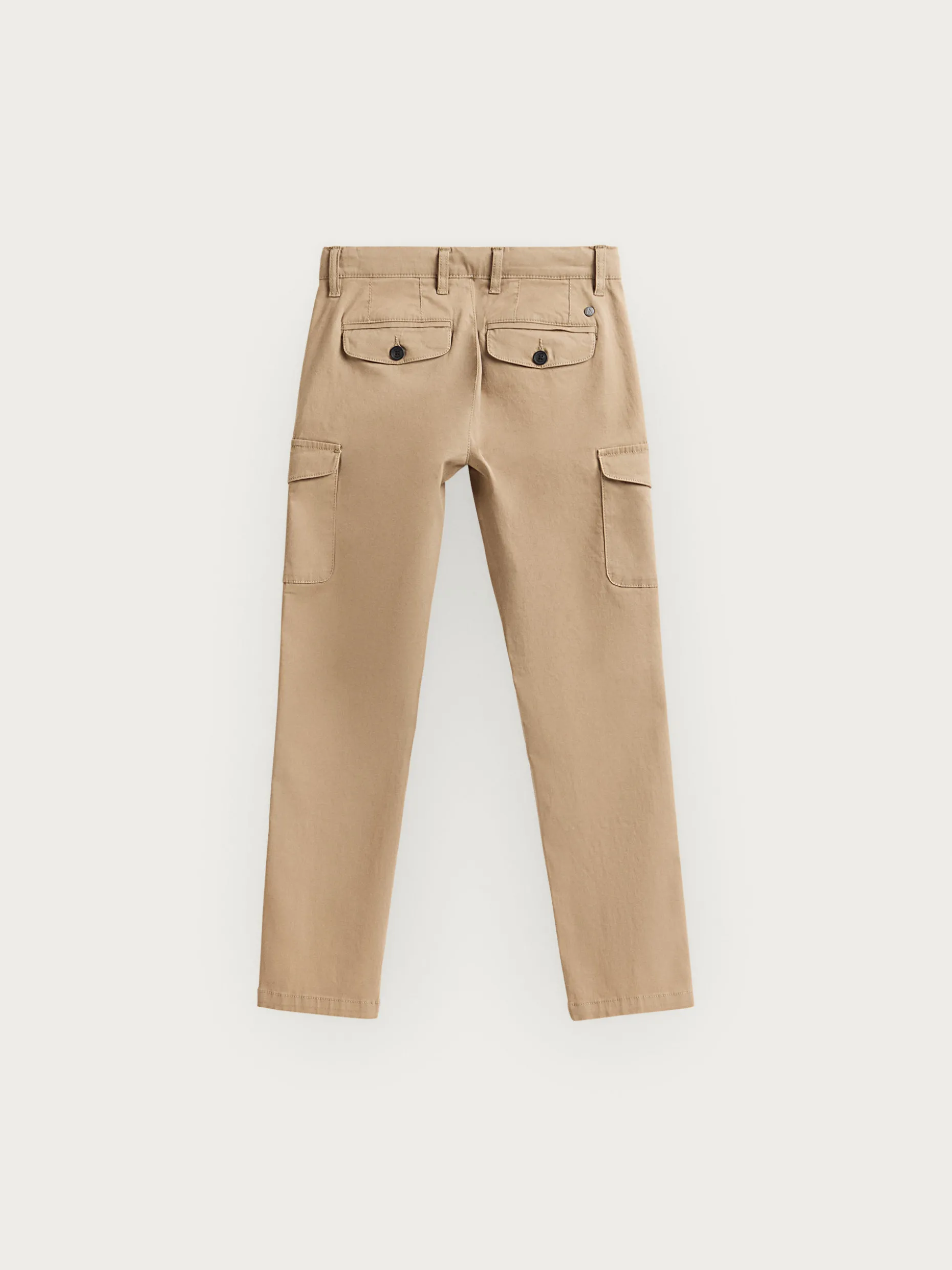 Pantalón cargo con cierre central mediante botón y cremallera. Dos bolsillos laterales y dos más bajos con cierre mediante tapeta y botón. Dos bolsillos traseros y logo grabado sobre uno de ellos. Corte regular fit.