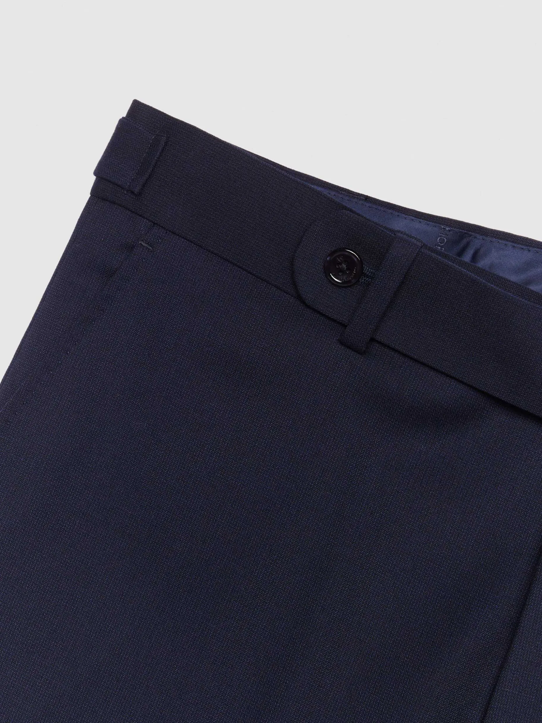 Pantalón de traje con tejido de ojo de perdiz que cuenta con cierre frontal con prolonga de botón desplazado y cremallera, dos bolsillos en el frontal y un bolsillo con cierre de botón en la parte trasera. Bajo con vuelta y detalle ajustable en la cintura. Forrado en su interior.