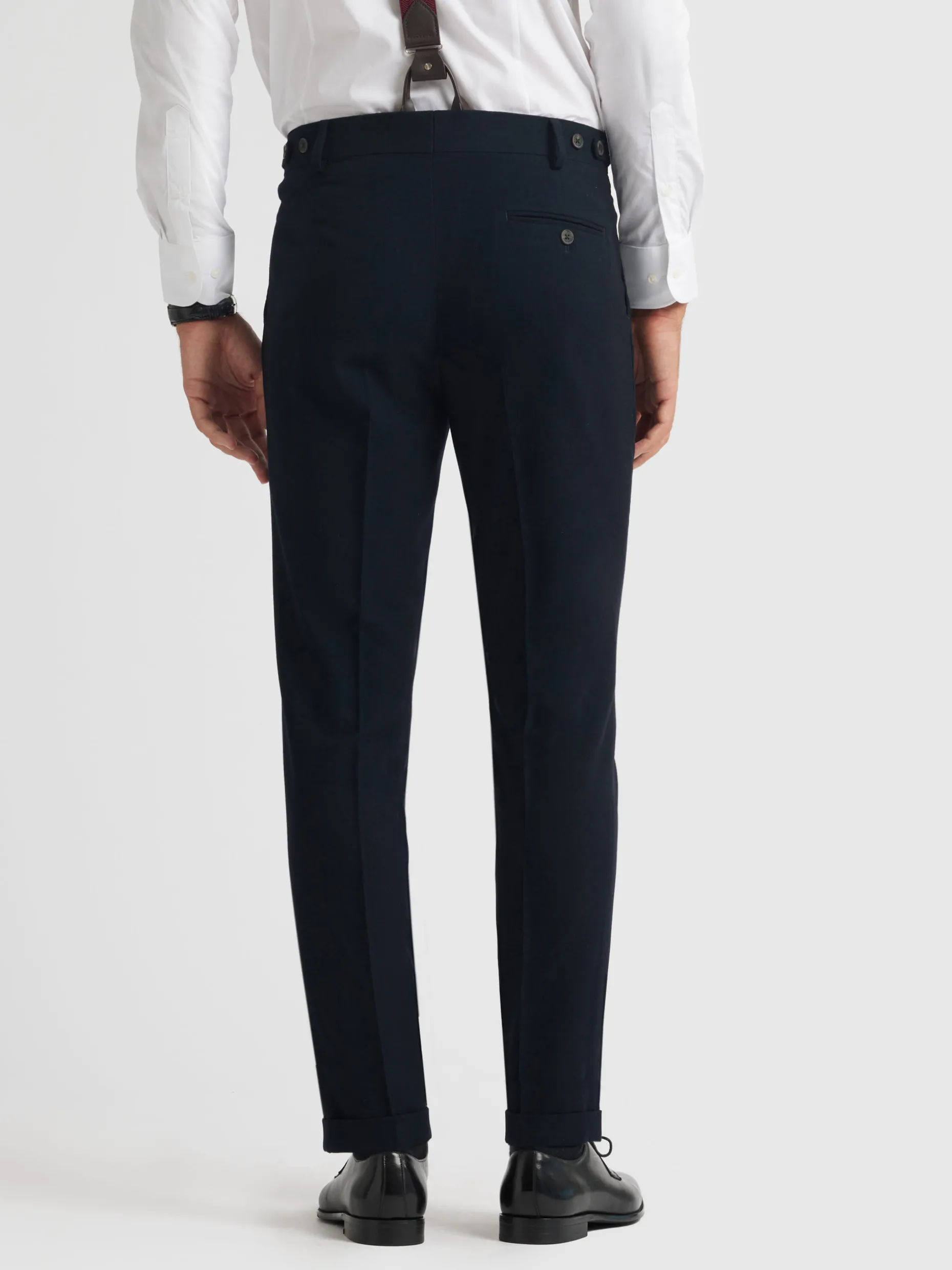 Pantalón de vestir que cuenta con el bajo doblado y pinzas en el frontal. Cierre frontal de cremallera y botones, dos bolsillos en la parte delantera y dos bolsillos traseros con cierre mediante botón. Forrado en su interior.