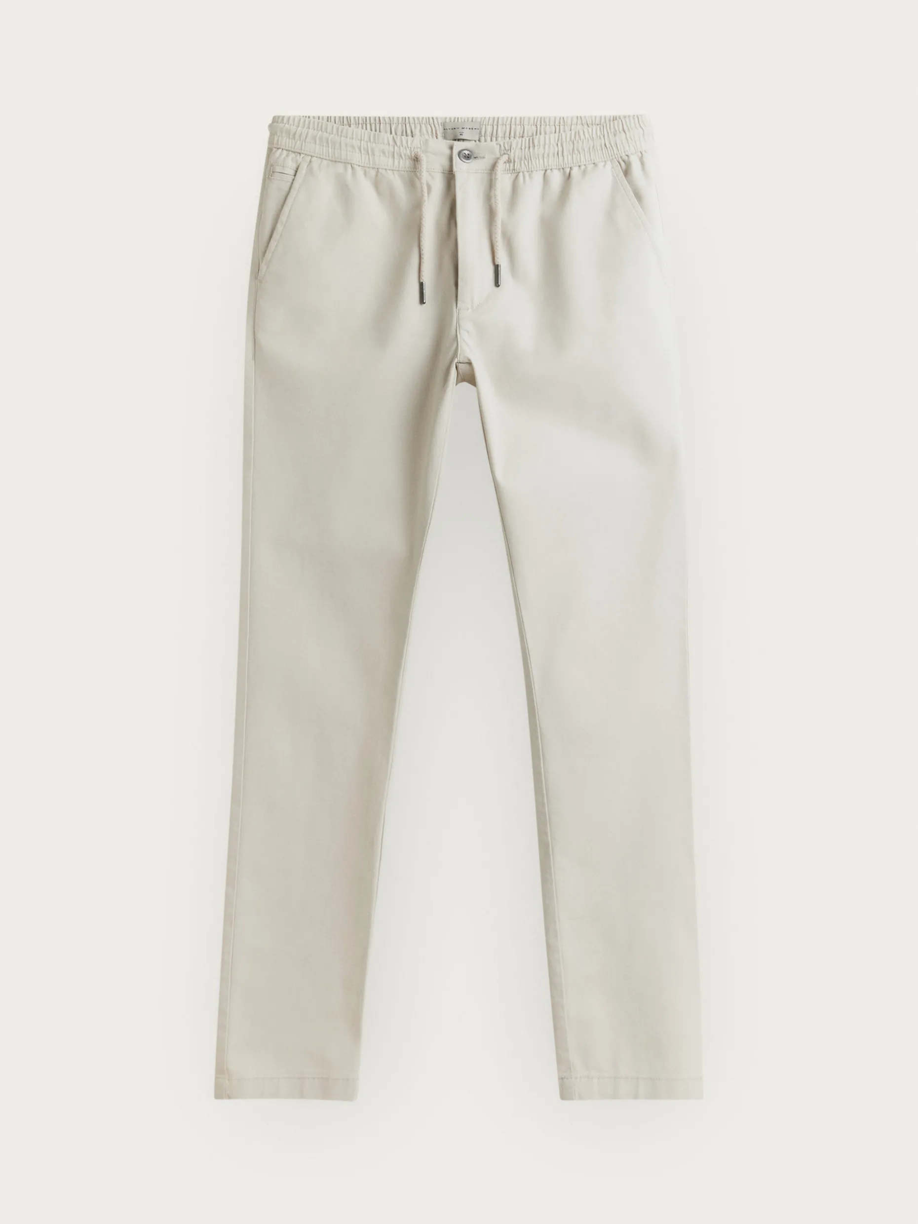 Pantalón con cordones ajustables al tono, cinturilla elástica y cierre mediante botón y cremallera. Tres bolsillos en la parte delantera y dos en la parte trasera con detalle personalizado sobre uno de ellos.