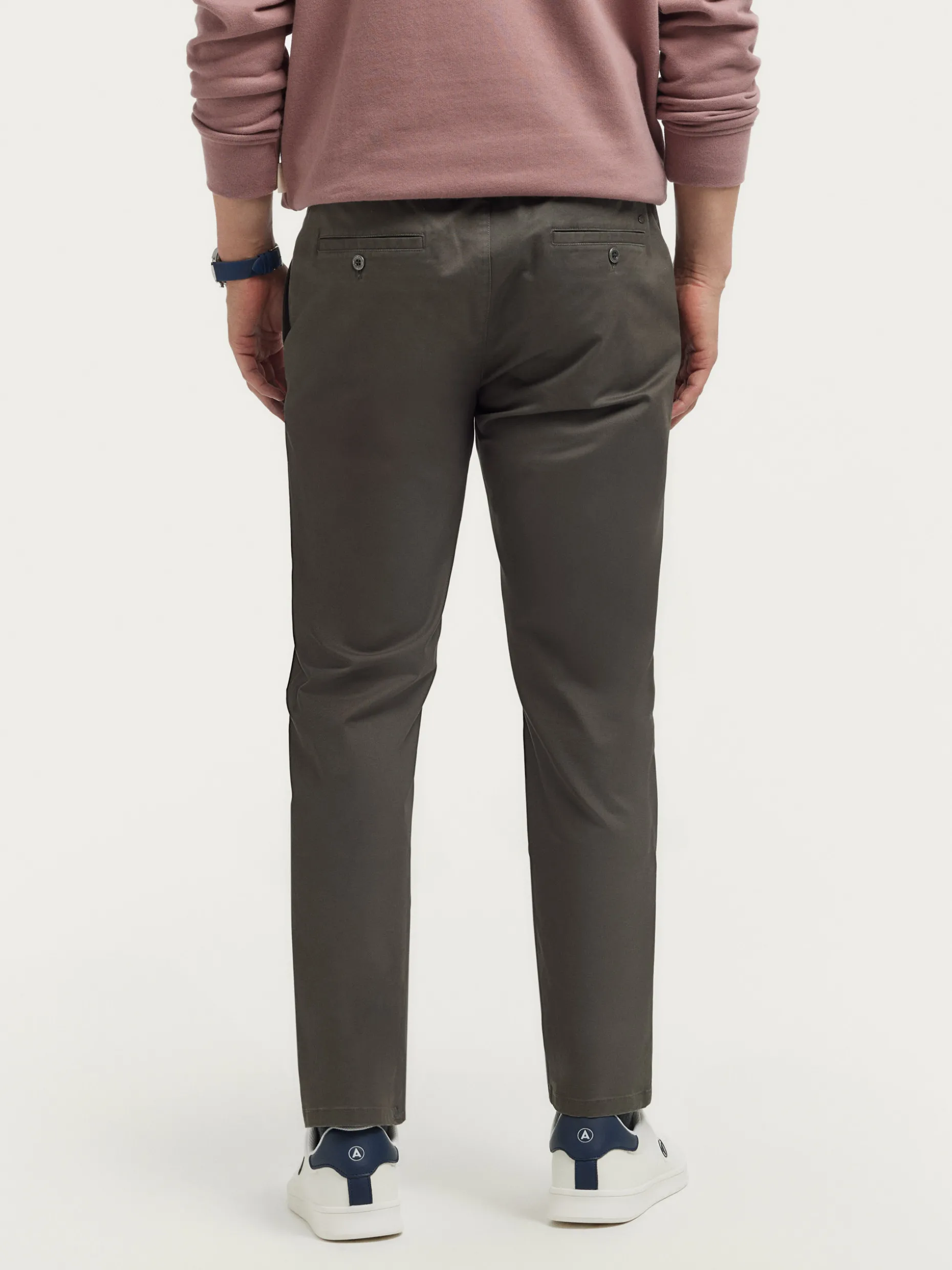 Pantalón con cordones ajustables al tono y cinturilla elástica. Cierre mediante botón y cremallera, dos bolsillos en la parte delantera y dos en la parte trasera con detalle personalizado sobre uno de ellos.