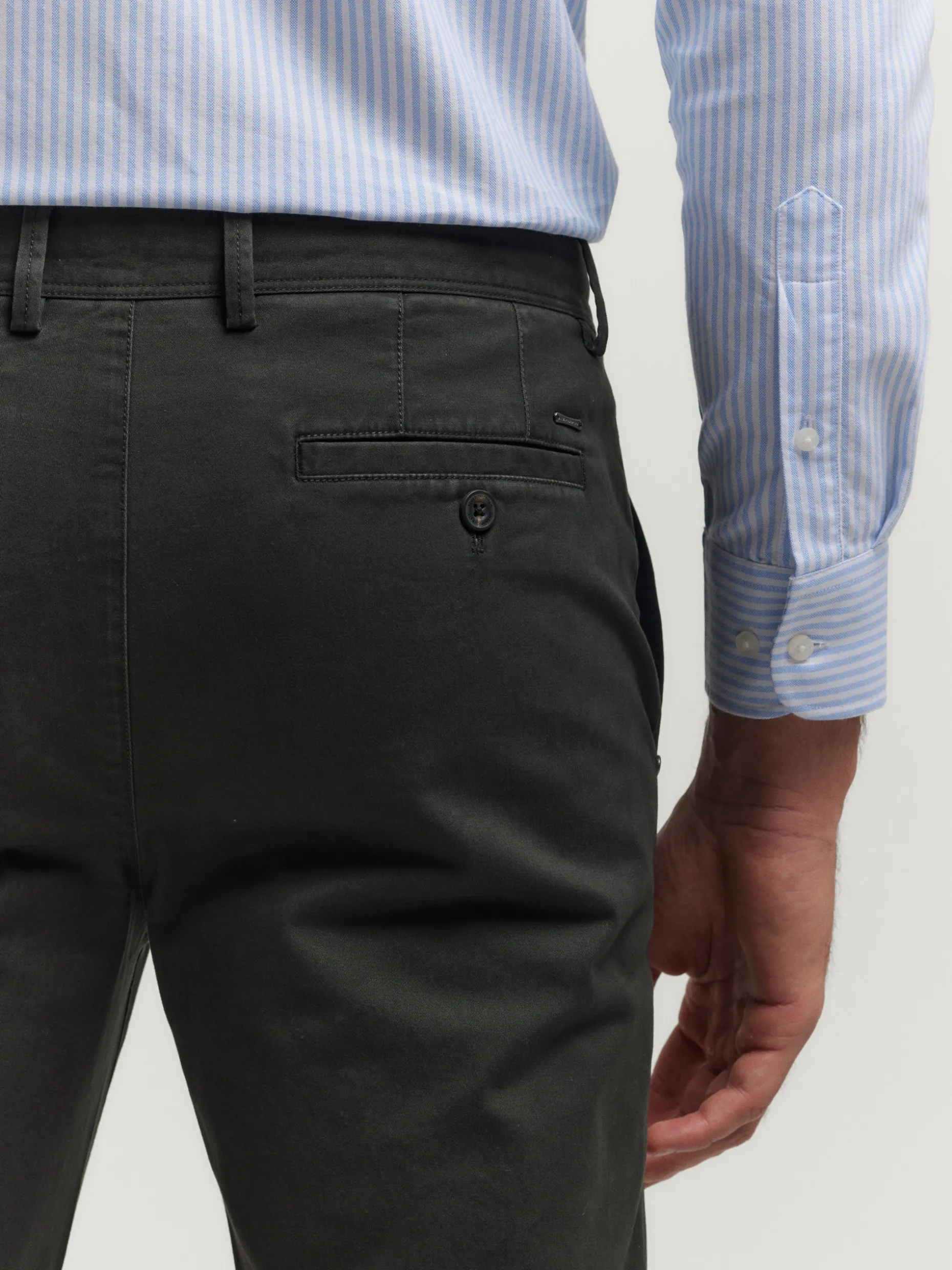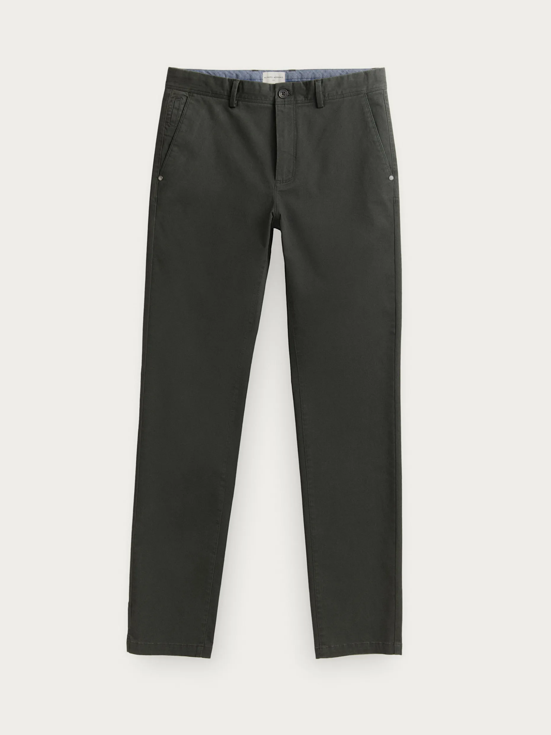 Pantalón estilo chino con cierre central de botón y cremallera, bolsillos tipo chino y detalle personalizado sobre uno de los bolsillos. Corte slim fit.