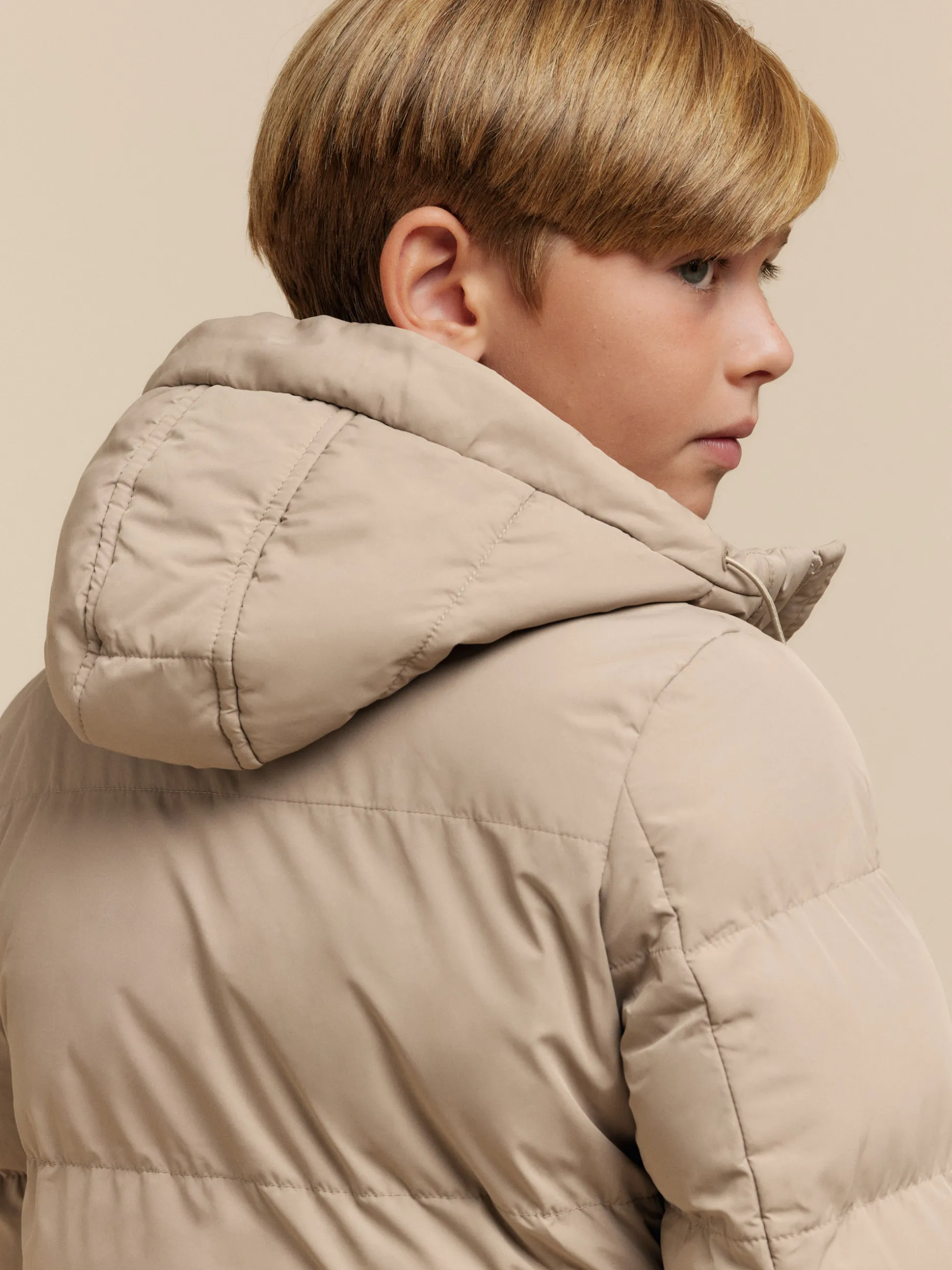 Parka acolchada con cuello subido y gorro ajustable. Cierre central mediante cremallera, dos bolsillos en la cintura con cierre de cremallera y manga larga con doble puño en punto elástico. Detalle personalizado engomado en una de sus mangas. Interior con bolsillo y forrado. Cremalleras termoselladas.