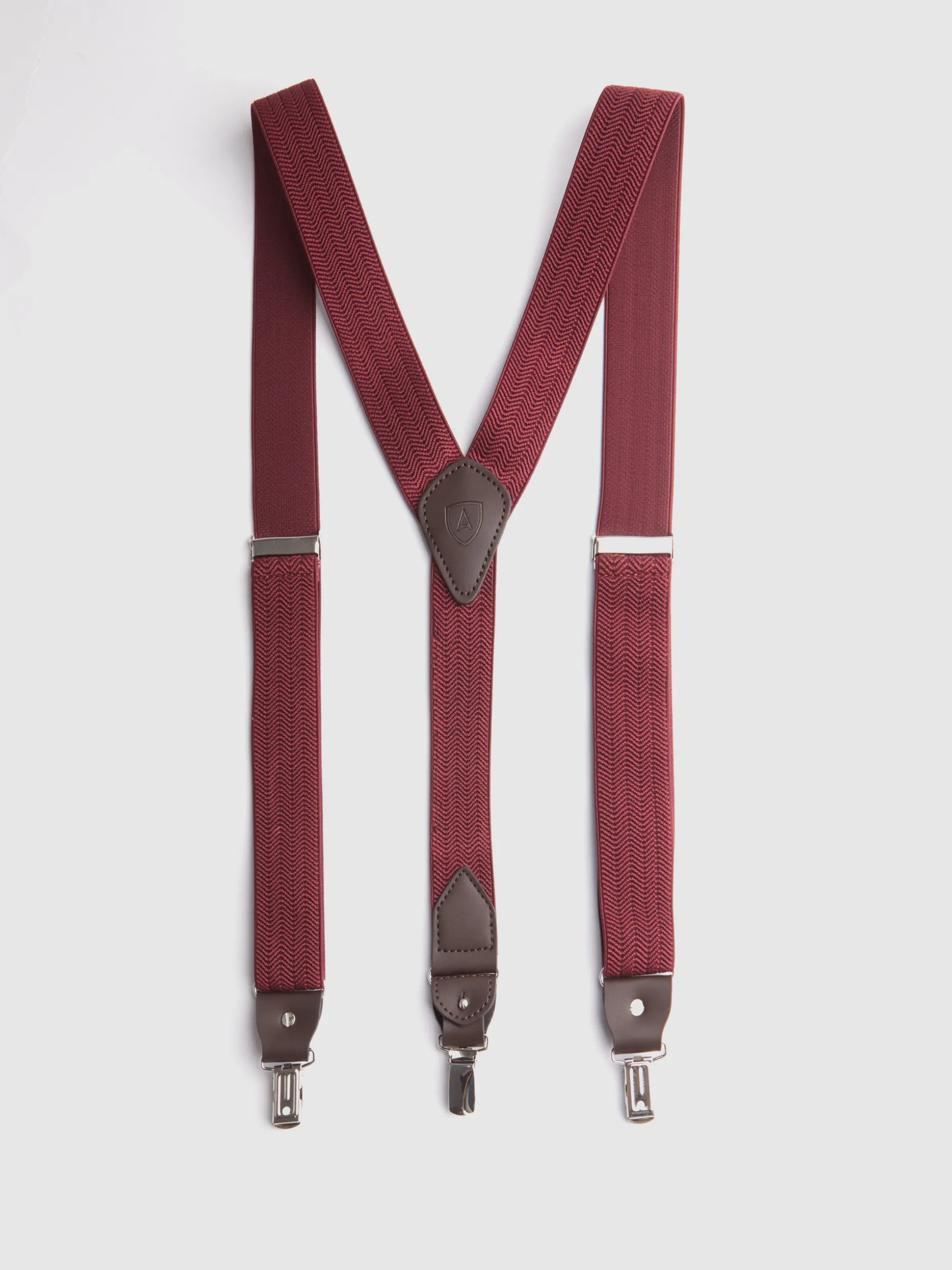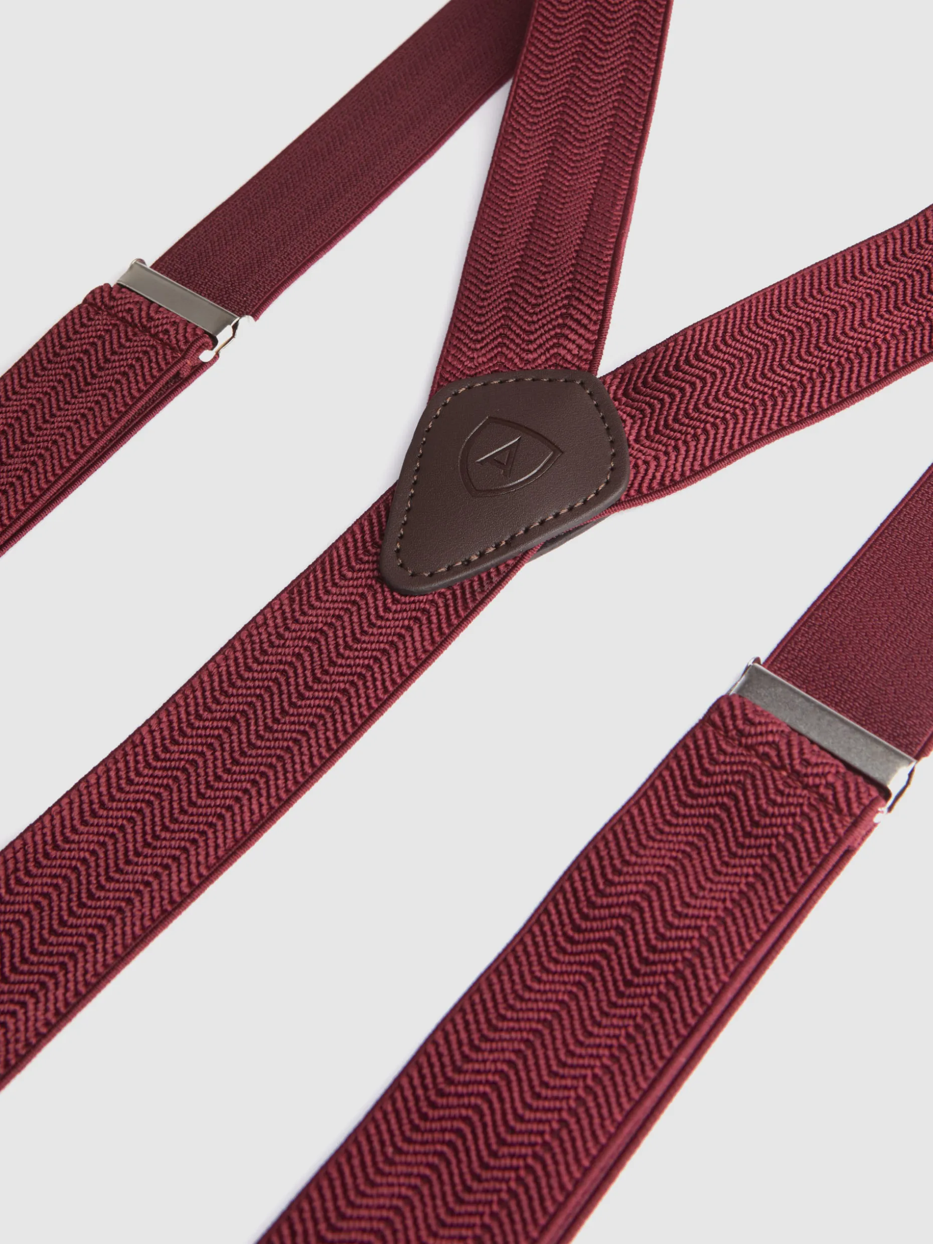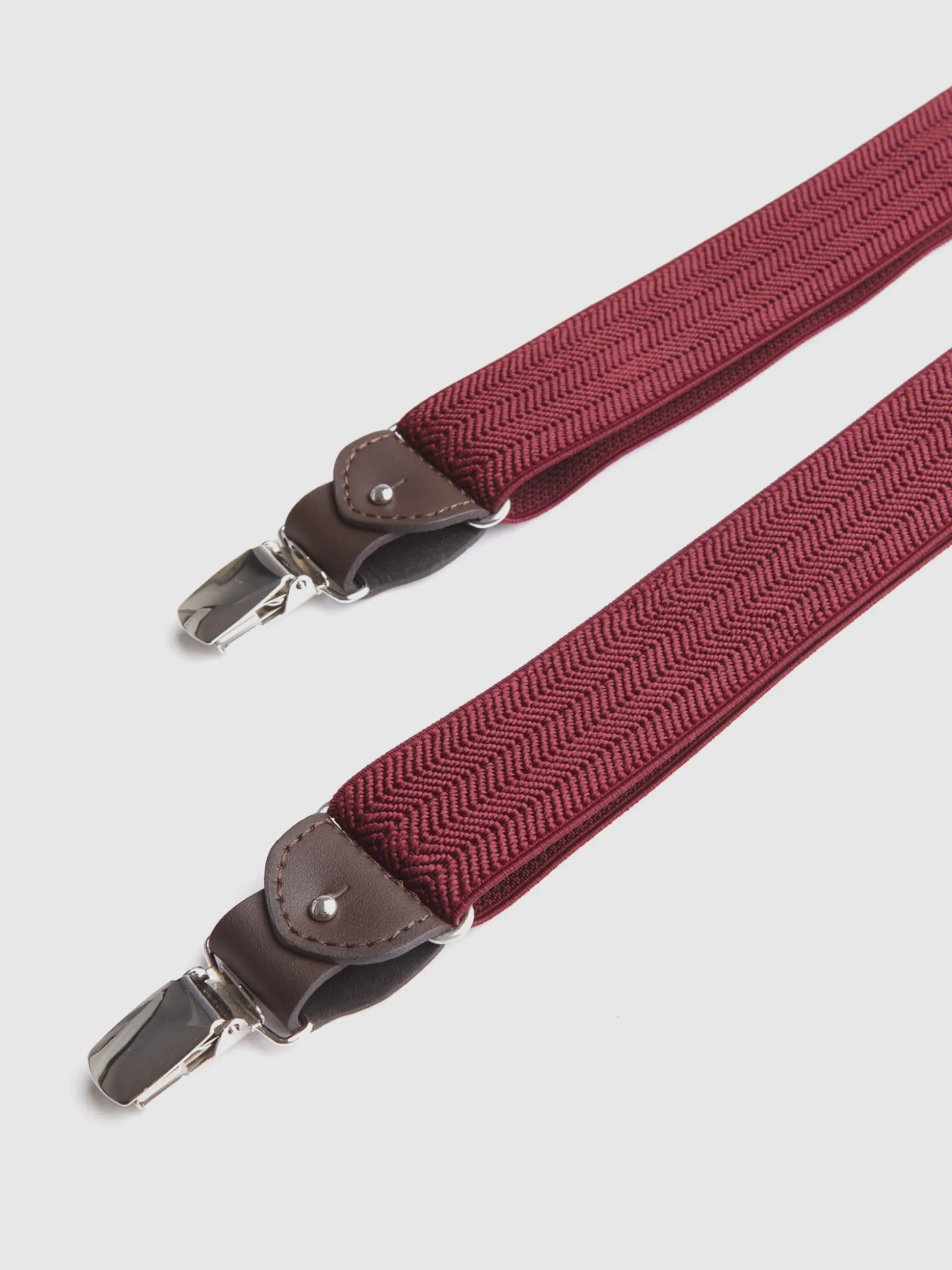Tirantes elásticos con tejido de espiga y aplique de piel personalizado en la espalda. Terminación con sujeciones intercambiables mediante pinzas metálicas o latiguillos.